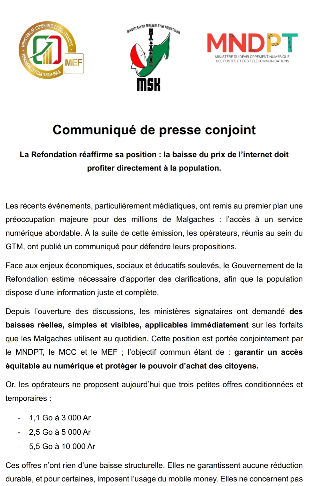 Communiqué de presse conjoint