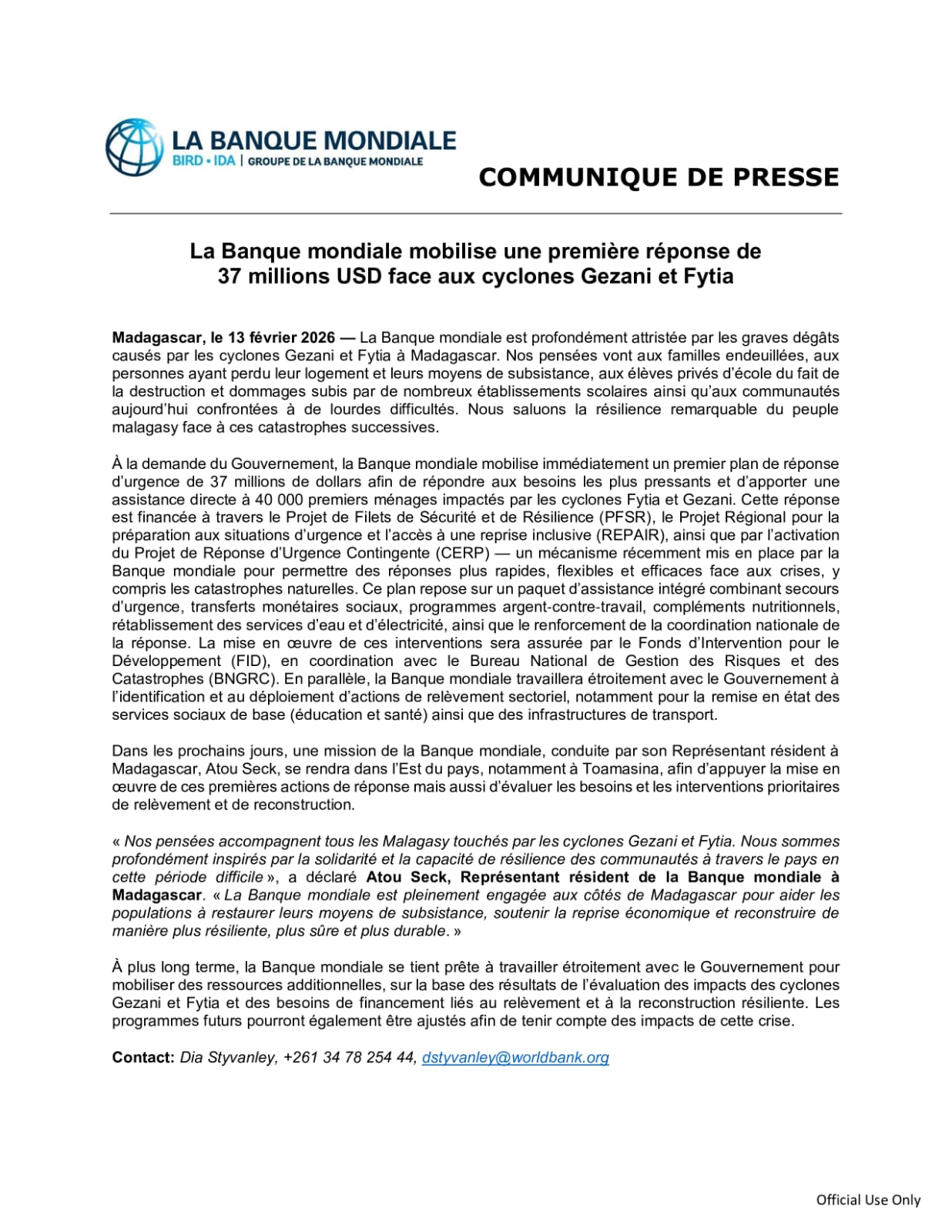La Banque mondiale mobilise une première réponse de 37 millions USD face aux cyclones Gezani et Fytia
